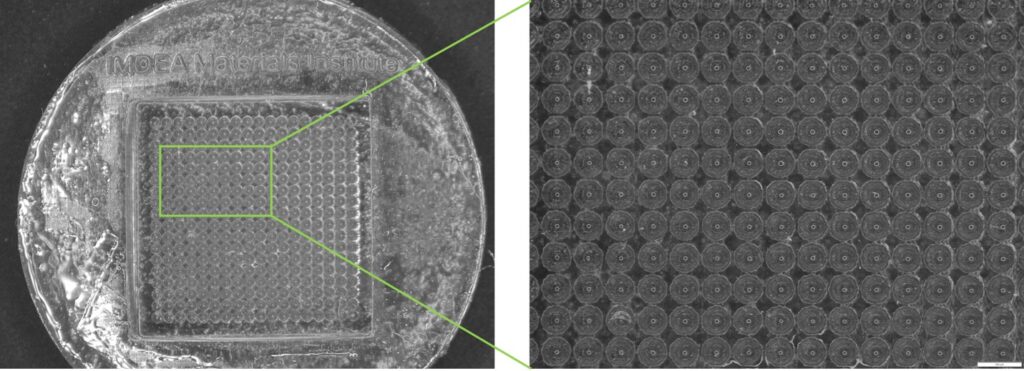 3D tissue models can be used in vitro (in the lab) for the study of diseases and the testing of novel drugs, including their incorporation into microfluidic devices to form the so-called “organ-on-chip” systems. 3D tissue models can also be used in vivo (i.e. implanted in the body) to directly promote tissue regeneration and treat damaged or diseased tissues. As an example of the former, IMDEA Materials is developing more advanced airway-on-chip models that better simulate the airway epithelium and stroma. As an example of the latter, our Institute is also studying devices for the formation of organoids (spheroid shaped structures that mimic the natural organization of cells within tissues) using high-resolution 3D printing technologies such as stereolithography (see Figure 1). We apply our comprehensive know-how in additive manufacturing technologies and 4D characterization in both cases.