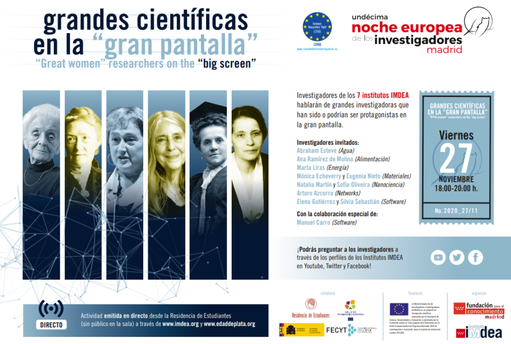 Researchers from the 7 IMDEAS institutes will talk about great researchers who have been or could be protagonists on the big screen. Our colleagues Monica Echeverry and Eugenia Nieto will be the protagonists of this great meeting. It will take place on November 27 from 6:00 p.m. to 8:00 p.m.