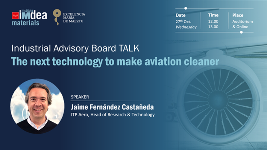 Within the framework of the different initiatives of the IMDEA Materials´ Industrial Advisory Board (IAB), we are pleased to invite you to the talk of Jaime Fernández Castañeda, Head of Research and Technology of ITP Aero. The talk, entitled “The next technology to make aviation cleaner” will take