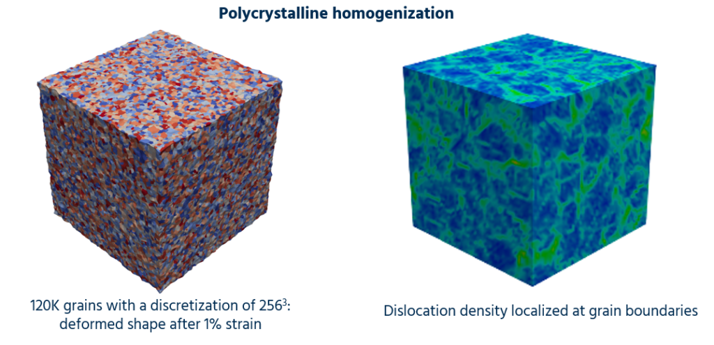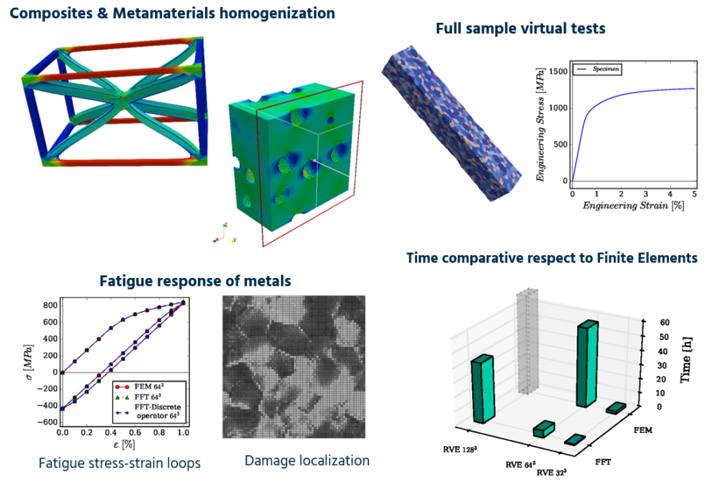 FFTMAD includes preprocessing tools for microstructure generation of composites and polycrystals. Any constitutive equation can be used for the behavior of the materials by either a materialsubroutine Abaqus-UMAT or a pre-programmed model as elasticity, hyperelasticity, elasto-plasticity and crystal plasticity. FFTMAD solver is parallelized in GPUs or threads and includes different schemes for linear and non-linear problems. Postprocessing is done using python tools and Paraview.