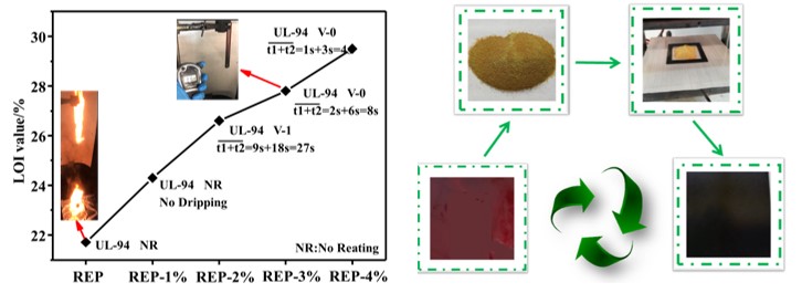 IMDEA Materials has developed a technology to produce Reprocessable Epoxy Resin (REP) composites with excellent fire retardancy and re-processability. Compared with pure epoxy resin with a Limited Oxygen Index (LOI) of 21.7 % and no rating in vertical burning test (UL-94), recyclable epoxy resin only with 3 wt% fire retardant acquired a LOI value of 27.8% and passed V-0 degree. Based on the results of cone calorimeter test, REP composites containing 4wt% fire retardant had excellent self-extinguish, showing the 43.5% drop of the peak heat release rate.