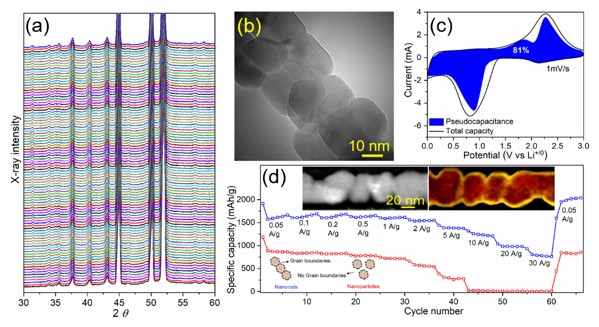 Li and Na-ion storage mechanism in most of the pseudocapacitive electrodes reported have not been systematically investigated. Improved performances are often assigned to surface storage, and the exact the mechanism is not clear. Advanced characterization techniques are therefore required to explain the crucial reasons for the defect engineered pseudocapacitive electrodes. For instance, IMDEA Materials has investigated pseudocapacitive Li-ion storage mechanisms (see Fig. 1) enabled by nanograin-boundaries of polycrystalline Co3O4 nanorods through in-situ X-ray diffraction and Electron Energy Loss Spectroscopy (EELS) analysis. These in-situ measurements can be also employed to investigate the Li/ and Na-ion storage mechanism of a variety of electrode materials.