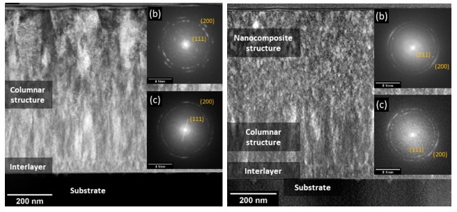 - The development of quaternary TiAlN coatings by the addition of other elements such as Cr, Si, Zr, B, Ni or others or the use of nanolaminated structures. In particular, a better understanding of the microstructure formation is seek with the objective of suppressing columnar growth, which is known to compromise the fracture toughness of the coatings. For instance, Fig. 1 show an example on how the addition of small amounts of Ni into a TiN coating suppresses columnar growth, which has strong implications on the coating fracture resistance.