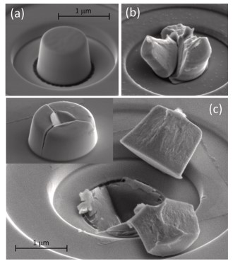 - The exploitation of novel advanced characterization techniques. Nowadays, the mechanical properties of coatings are characterized by conventional nanoindentation tests. However, IMDEA Materials is expert on the application of novel nanomechanical tests in coatings, such as high temperature nanoindentation for the determination of hardness at elevated temperature, the micropillar splitting test (Fig. 2) for the determination of fracture toughness or the incremental Focused Ion Beam (FIB) milling technique for the determination of residual stresses. These techniques provide valuable fundamental information for the development of new coatings for extreme environments that cannot be obtained by conventional testing approaches.