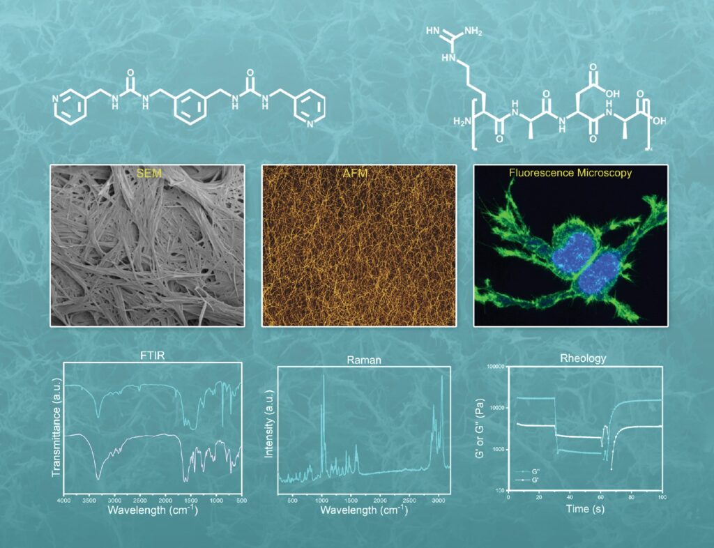 Hydrogels can be formed from polymers or from small molecules, from either natural or synthetic sources. Further, they can be classified by the types of bonds that form the hydrogel network – either covalent or non-covalent. Supramolecular hydrogels, particularly those formed from the non-covalent self-assembly of small molecule gelators, are relevant for biomedical applications because they have interesting properties. For example, some can be injected through a needle (like a liquid) and reform into a solid structure, and they mimic the hydrated microenvironment of cells in the body. One such type of novel supramolecular hydrogel developed by IMDEA Materials is based on a bis-urea derivative (Figure 1), which has shown unexpectedly good results in supporting the viability and growth of cells [1]. Another example, also developed by our Institute, uses self-assembling peptides to form a nanofibrous hydrogel network [2]. We have state-of-the-art equipment to enable the characterization of the chemical, mechanical, and morphological properties of both the gelator compounds and the hydrogels [3] and new cell culture facilities to evaluate their cytocompatibility.
