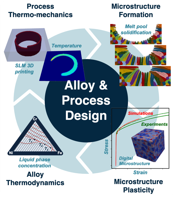 Ongoing activities include combining computational thermodynamics, FE process thermomechanics, PF modeling of microstructure formation, and CP for SLM of Nickel-based superalloys for high-temperature aeronautical applications; and leveraging computational thermodynamics and advanced material characterization to design compositionally/functionally graded steels and metal components via Direct Energy Deposition (DED) technology.
