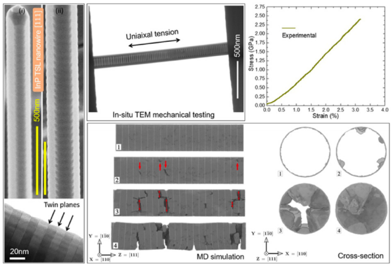 It has been shown that InP semiconductor nanowires carry charge and excitons efficiently and also exhibit very high optical efficiency. Their mechanical properties are extremely important, as mechanical strain strongly