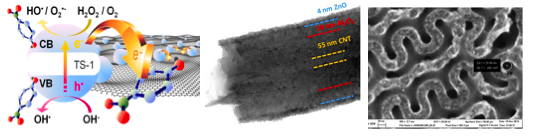 Fig: a) Working princliple of nanocarbon-inorganic hybrid photocatalyst; b) model system with dielectric barrier layer (Al2O3) between a photoactive ZnO shell and CNT inner core; b) ordered mesoporous carbon with gyroid architecture.
