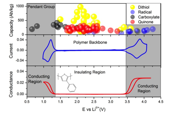 Figure 1: The upper panel shows the specific charge storage capacity and redox potential of dithiols (yellow), nitroxide radicals (blue), conjugated dicarboxylates (black) and quinones (red) that have been tested as active battery materials.[1] The mid- and lower panel shows cyclic voltammetry (blue line) and in-situ conductivity (red line) of polyphenylthiopnene in MeCN with the conducting and insulating regions for this polymer indicated as shaded and white fields respectively.