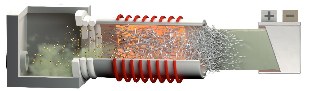 It all started more than three years ago when the group, led by Juan José Vilatela, developed a method for producing battery electrodes much simpler and more sustainable than existing ones. It allowed them to make them of silicon instead of graphite (Figure 1). This substitution is essential since graphite is one of the critical raw materials defined by the European Union because Europe has no reserves, and most of the existing ones are controlled by China. Silicon, on the other hand, is very abundant. Moreover, it can be converted into anodes with ten times the capacity of the current ones using the process developed by the Multifunctional Nanocomposites group (Figure 2). This process is cheaper and more environmentally friendly since it eliminates solvents and highly polluting processes. The resulting batteries would be more affordable and with twice the capacity.